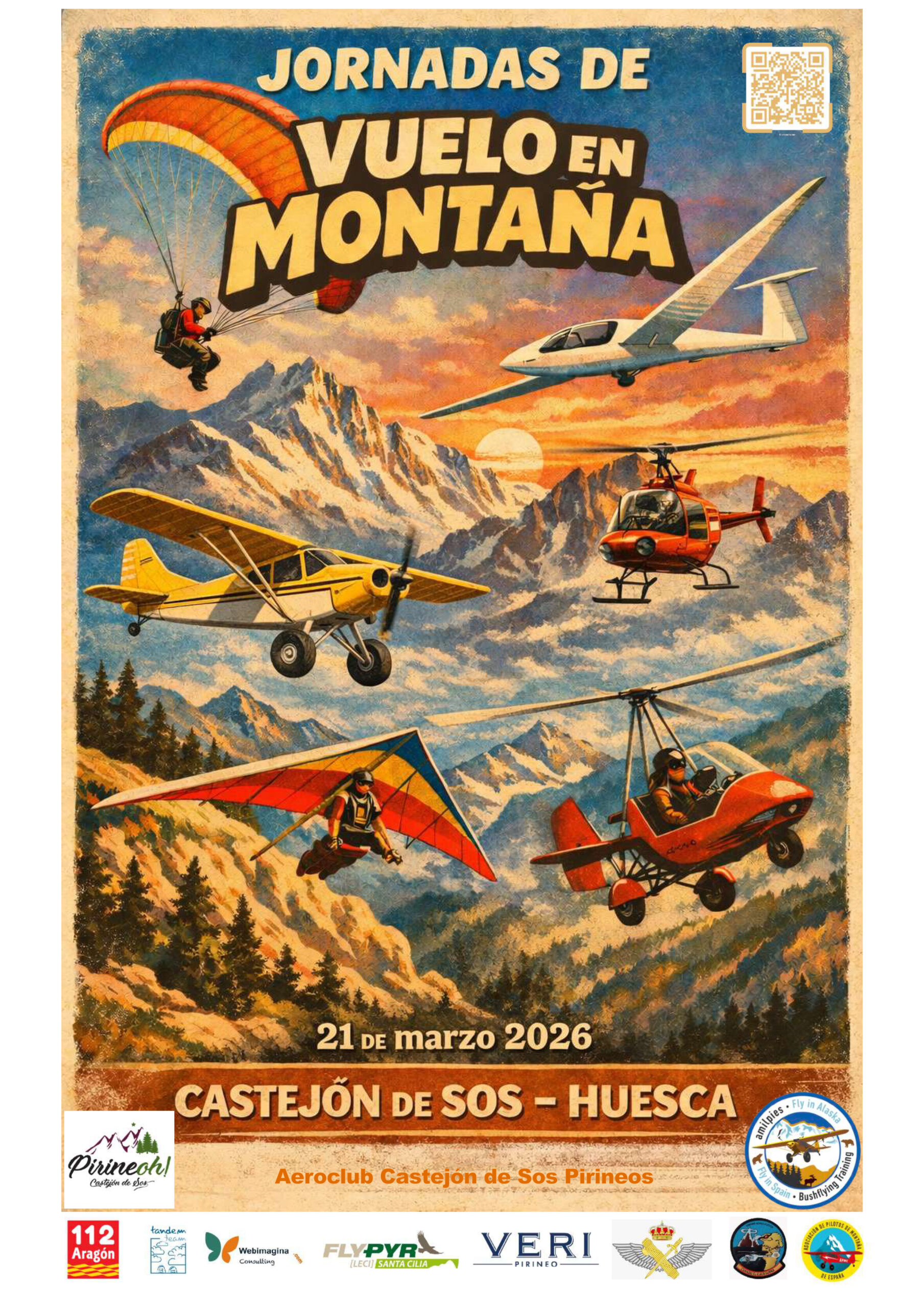 Organizadas por Amilpies, con la colaboración del Aeroclub Castejón Pirineos y el apoyo institucional del Ayuntamiento de Castejón de Sos, estas jornadas reúnen a profesionales y especialistas para compartir conocimiento aplicado sobre vuelo en montaña, centrado en seguridad operativa, análisis del entorno y toma de decisiones.
